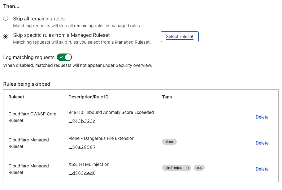 Note: You may also want to consider adding a rule to skip the CMS-specific rules you enabled for non-CMS sections of your site if they cause any issues. Just follow the steps above, and set it to skip any of the Cloudflare Managed Ruleset rules that were enabled above. You can set this based on hostname, URI, or cookie, using the operators does not equal, does not match, or does not contain.